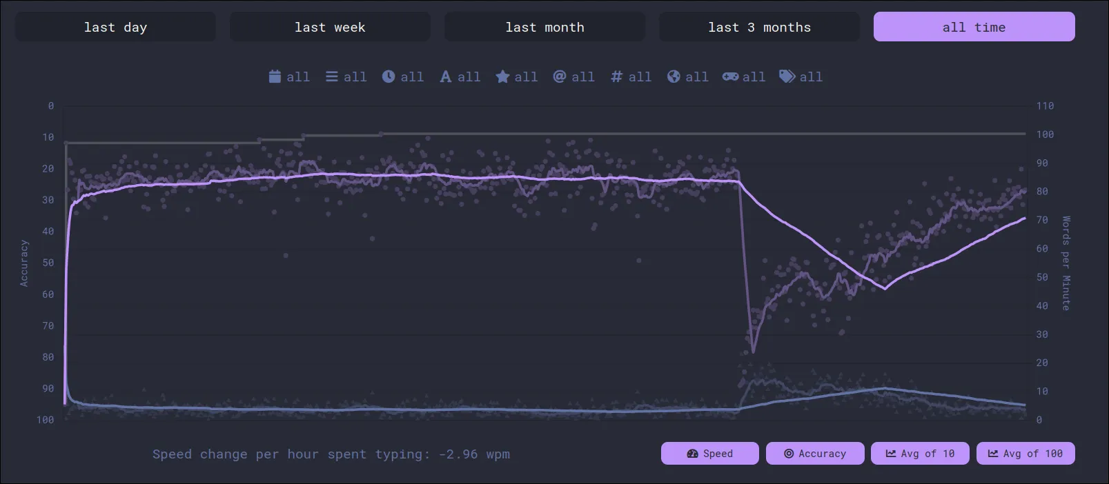 But that was to be expected. I knew that transitioning to an ortholinear keyboard would be painful so I had to just power through it.